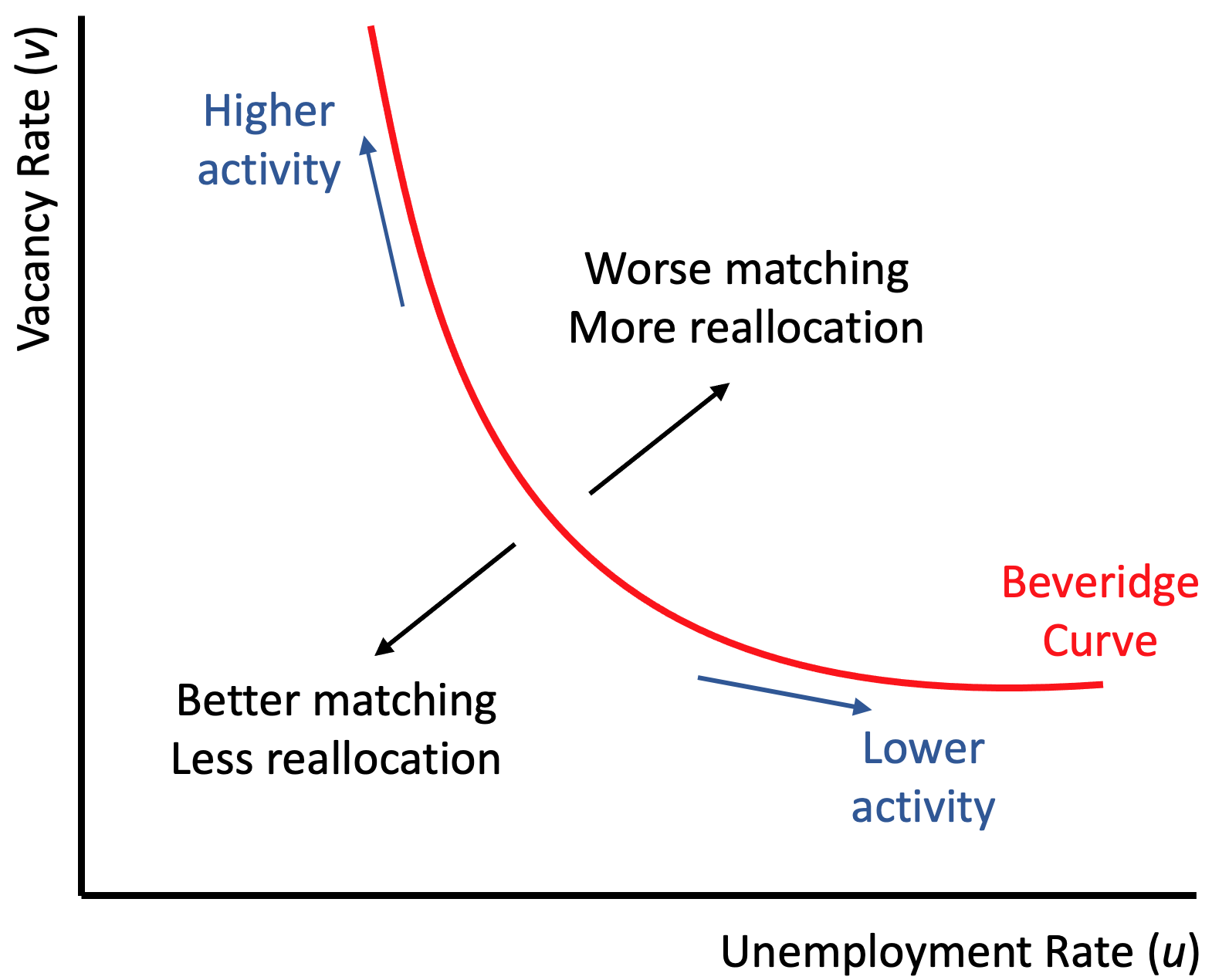 Importantly, the Federal Reserve has no way to influence the efficiency of the labor market. Instead, their tools change the level of aggregate activity. Put differently, Fed policymakers can influence where the economy is along a given Beveridge curve, but they have no way to shift the curve itself.
