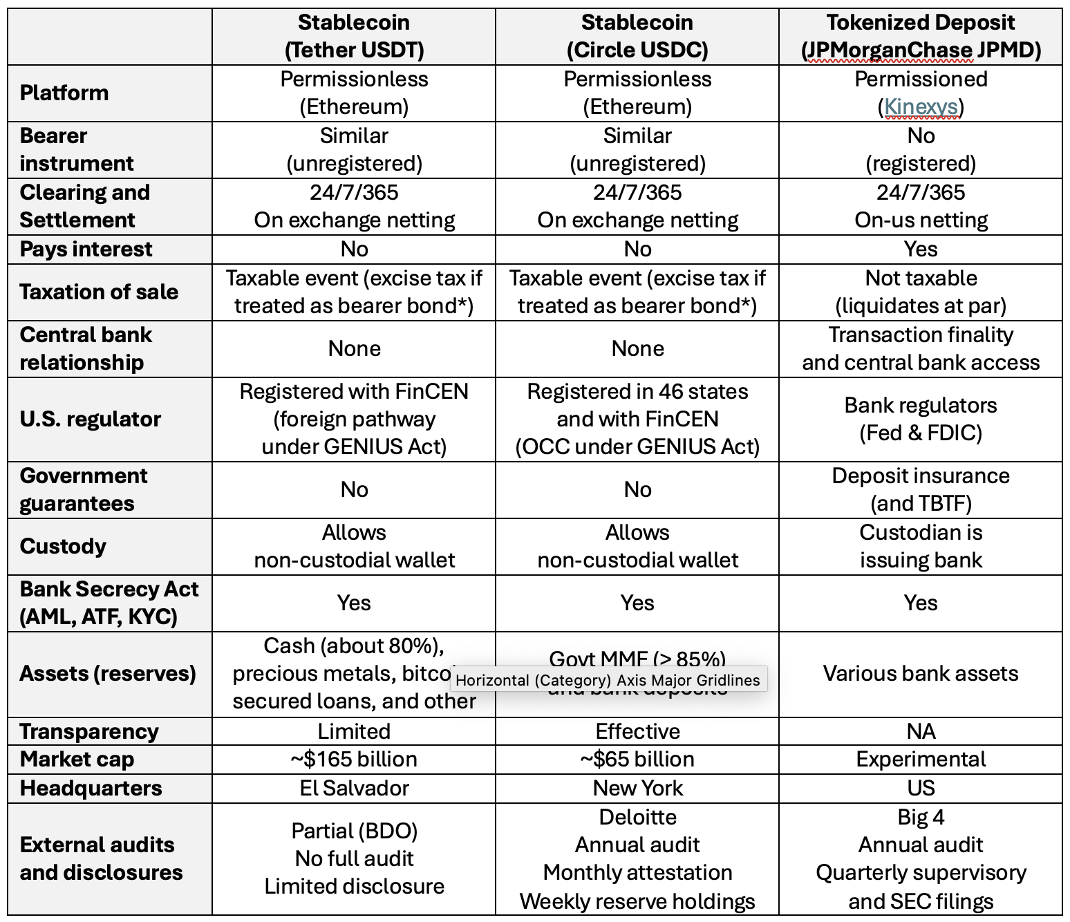The characteristics of stablecoins stand in sharp contrast to those of a tokenized deposit, in this case JPMorganChase’s JPMD, which aims at institutional clients and is in an experimental stage.