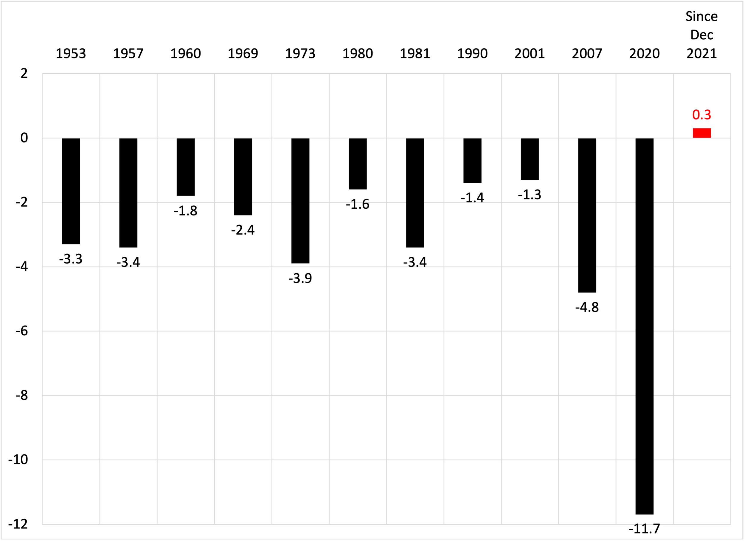 Change of employment ratio in recessions since 1950 and in period since December 2021 (percent)